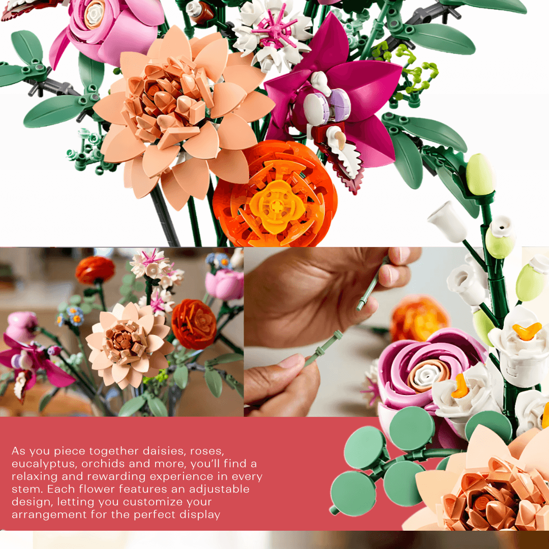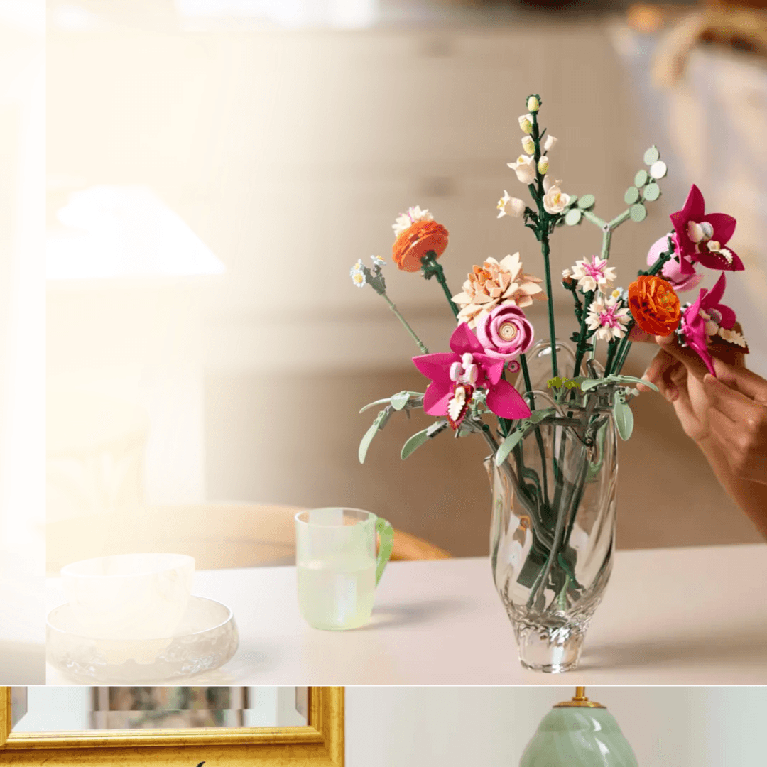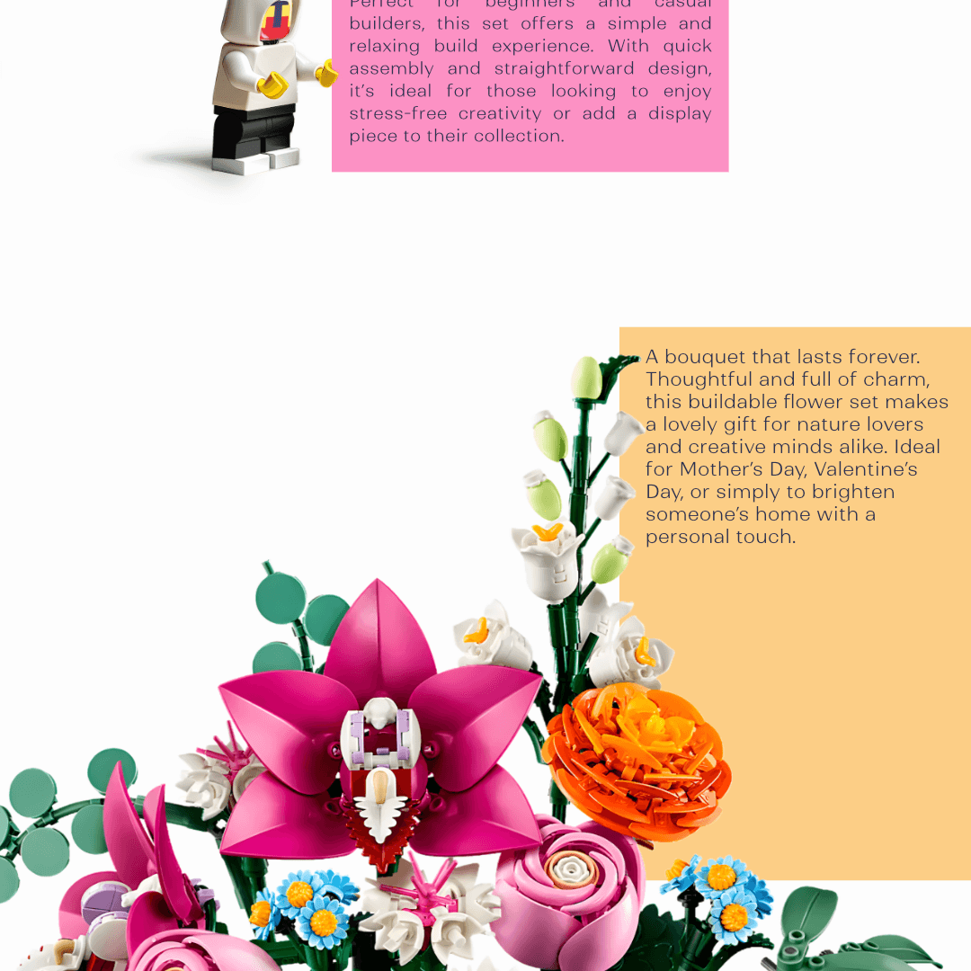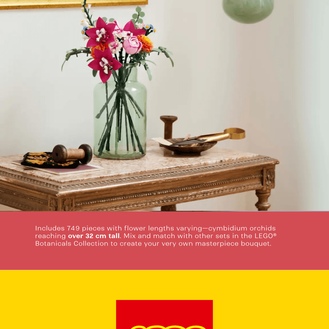 Budding florists can relax and unwind as they build the bouquet, which consists of 15 LEGO flower stems, including daisies, cornflowers, eucalyptus, elderflowers, roses, ranunculus, cymbidium orchids, a waterlily dahlia and a campanula. All the stems are adjustable, encouraging builders to arrange a bespoke bouquet that they can use as floral home or office decor. For added customization, the flowers can be arranged with other LEGO bouquets, sold separately, to create a larger, unique floral display.