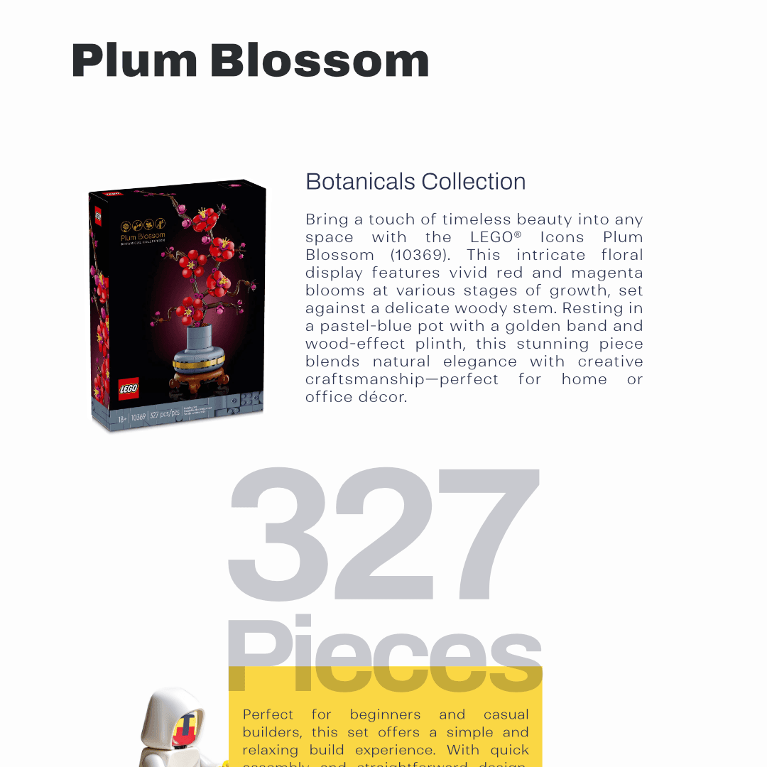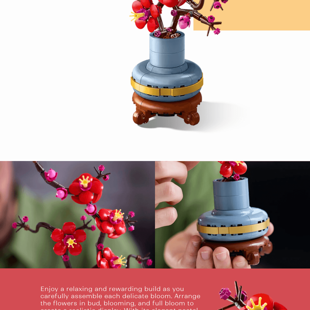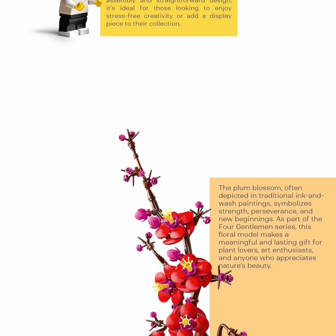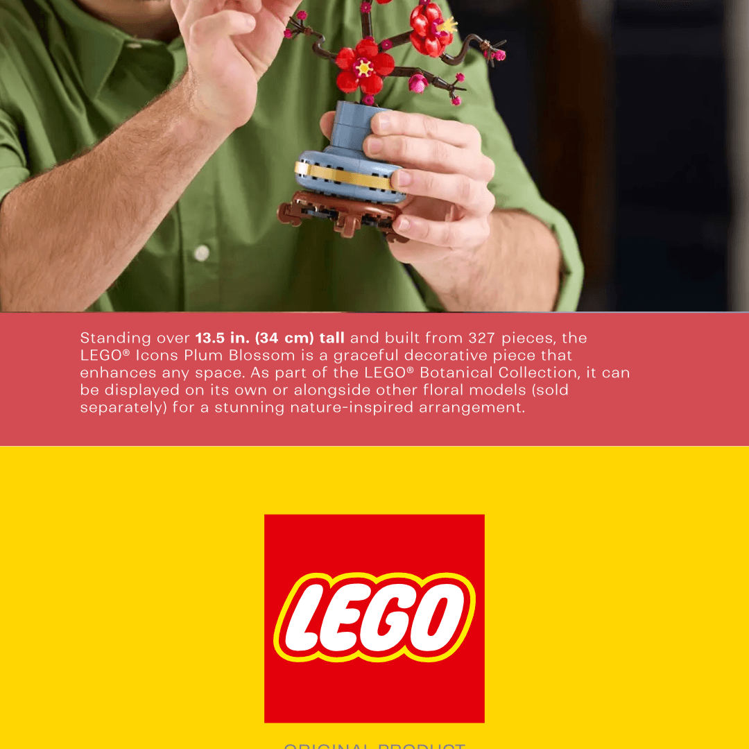 Take time out with the LEGO® Icons Plum Blossom (10369) flower decor building set for adults. The plum blossom is a popular motif in traditional art, often portrayed in ink-and-wash paintings as part of a classic quartet of beautiful plants known as the Four Gentlemen. Indulge in a mindful building project or treat a loved one to this timeless floral display – a perfect gift idea for any occasion.