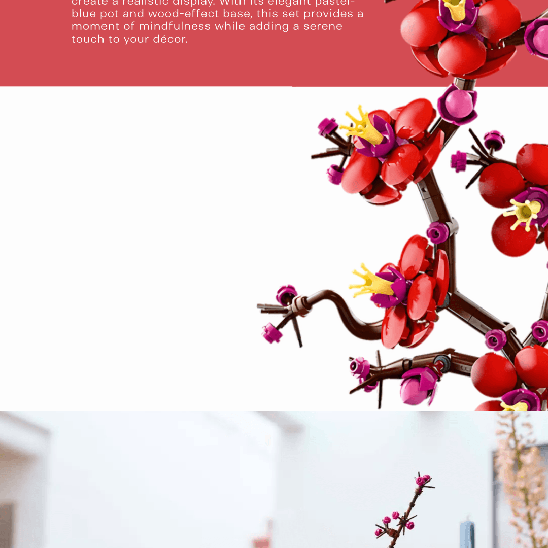 This detailed replica captures the elegance of the iconic winter plant with its woody stem and vivid red-and-magenta flowers. Set in a pastel-blue flowerpot with a golden band and wood-effect plinth, it is easy to assemble, delivers a rewarding building experience and makes a beautiful, easy-care flower display for the home and office.